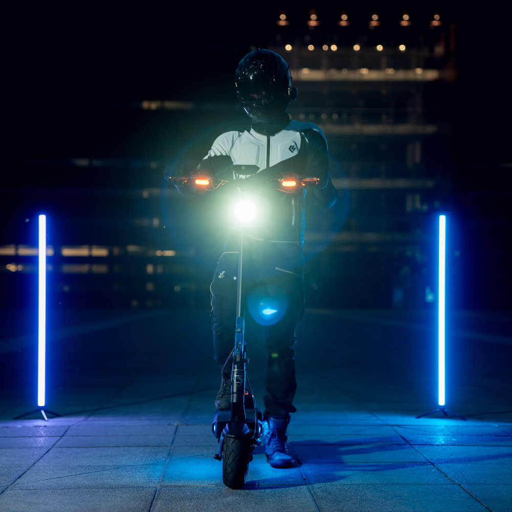 Z Hiley Tiger 10 V5 będziesz widoczny w nocy. Hulajnoga posiada kierunkowskazy zarówno zintegrowane w tylnej lampie jak i z przodu. Do dyspozycji użytkownika jest mocne przednie światło, światła LED przednie i tylne stop w podeście. Szczególnie w nocy uwagę przykuwają boczne paski LED RGB sterowane z aplikacji na telefon.